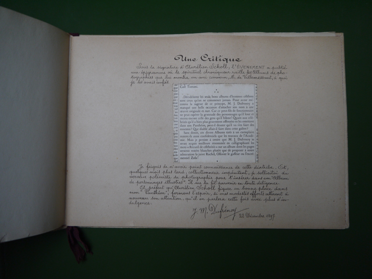 31 retirages de photographies anciennes représentant des personnalités du 19ème (Nerval, Maupassant, Baudelaire, Hugo, Clémenceau…), accompagnés d’une brève notice. Mention « Fin du troisième album » en dernière page. Une introduction en forme de règlement de comptes envers le critique Aurélien Scholl est datée de 1897.